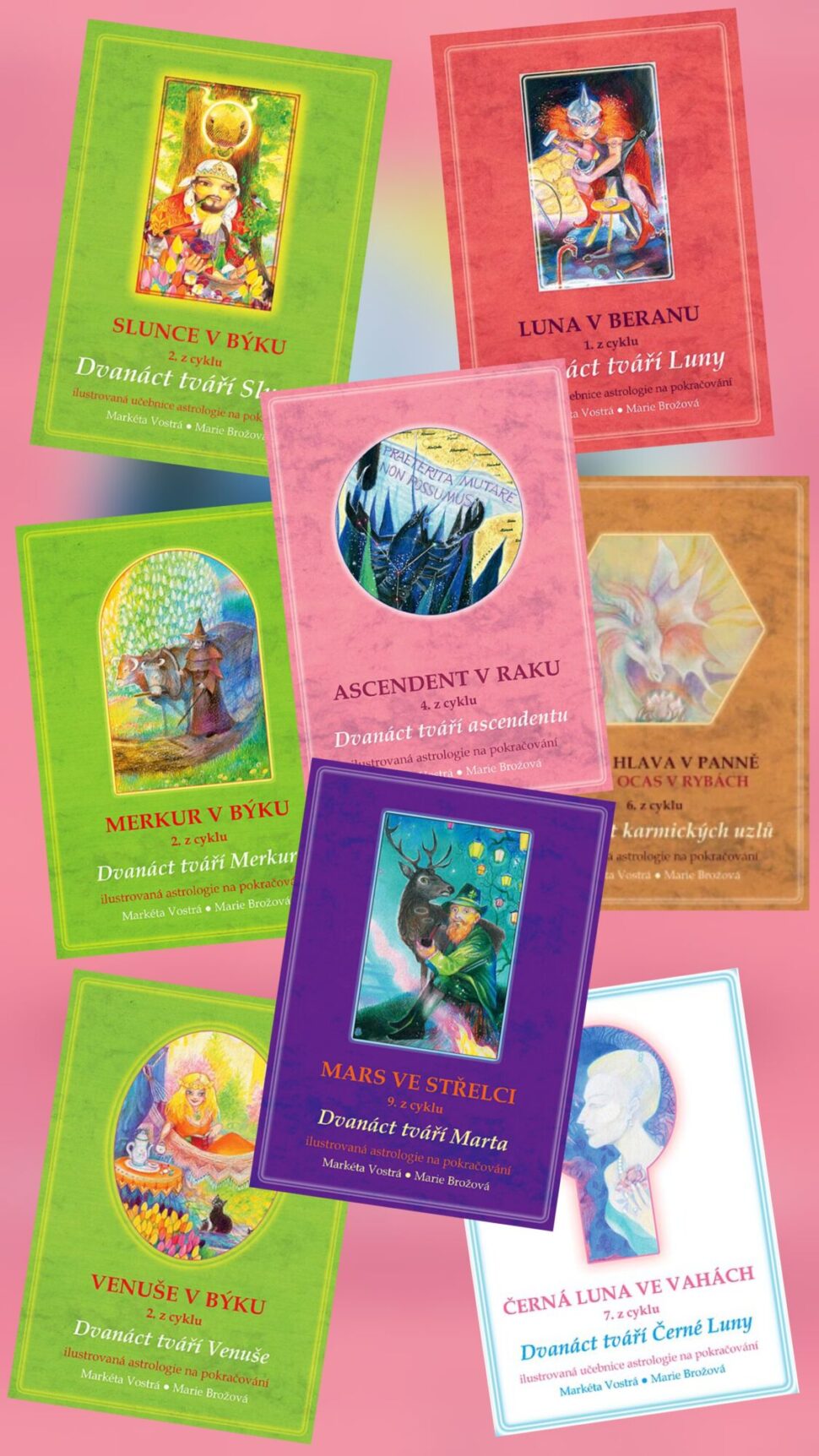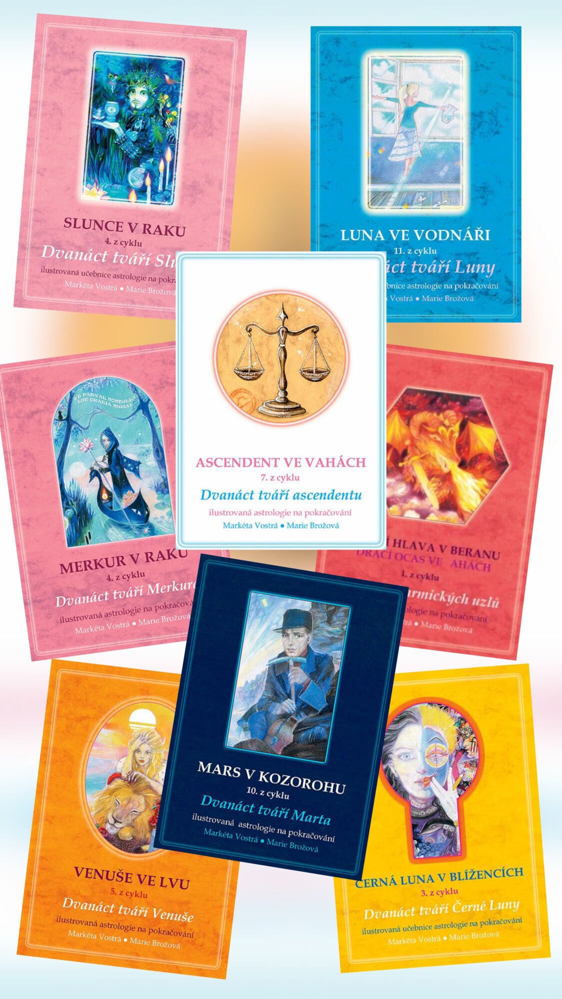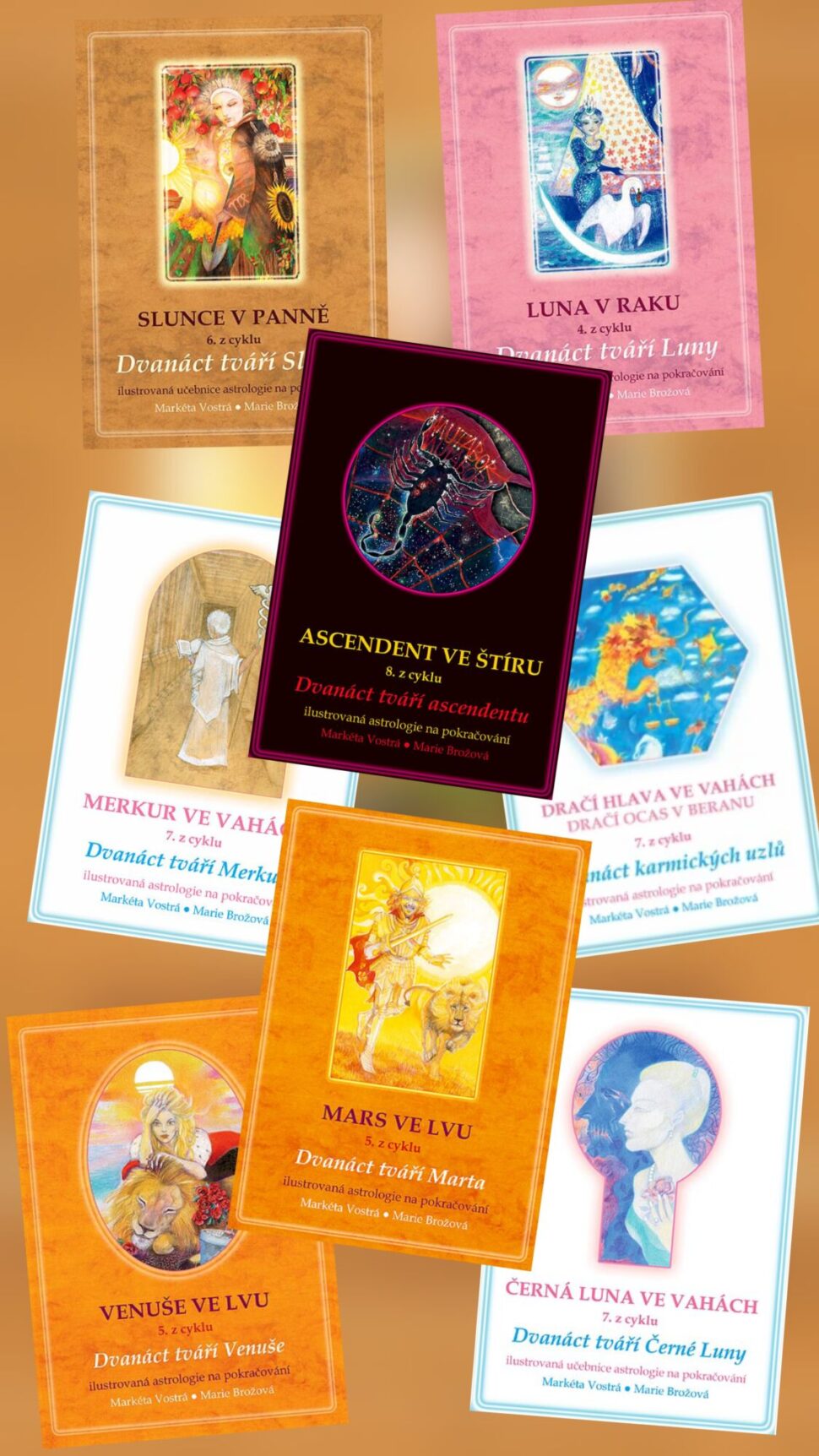 Sada Astrobrožur se skládá ze Slunce, Luny, Ascendentu, Merkura, Venuše, Marta, Černé Luny a karmického lunárního uzlu.